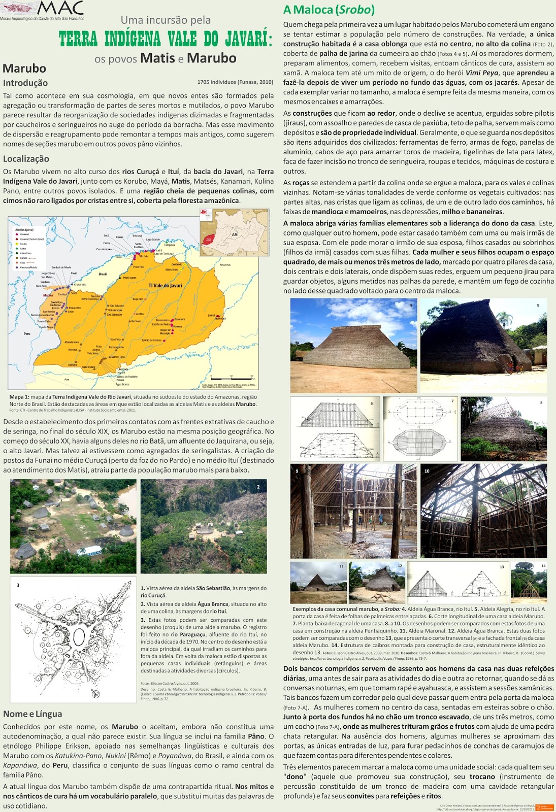 Leia sobre a organização espacial das aldeias e as técnicas de construção das grandes casas comunais dos povos Matis e Marubo. Acompanha um folheto com dados para contato com o MAC, sua localização e horários de funcionamento.